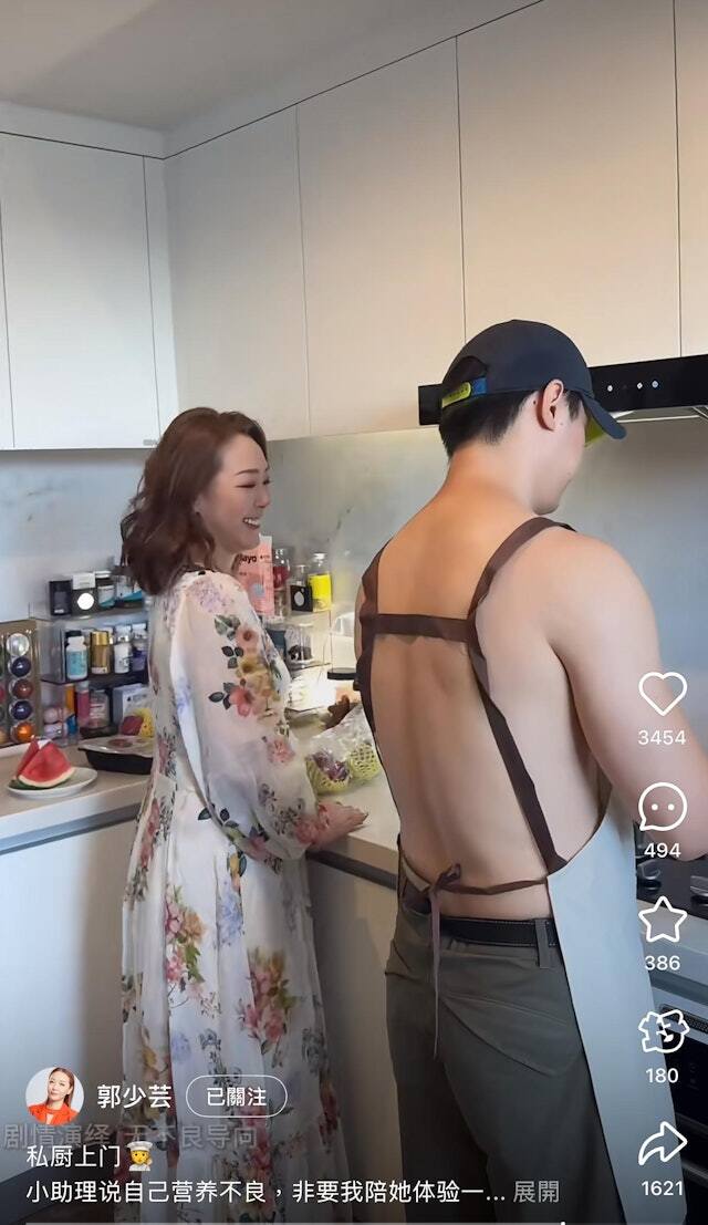 而近期郭少芸在社群平台上傳一段邀請年輕肌肉男廚師到府下廚的影片,為了讓年輕廚師脫上衣煮飯,她甚至刻意調高冷氣溫度。當看到對方露出精壯身材,她更藉故說「油好像濺到你了」,頻頻觸碰對方手臂。當得知這位肌肉廚師僅25歲時,郭少芸更笑稱:「沒事我反過來!」最後還獲得小鮮肉親手餵食,讓不少網友看了都直呼羨慕。