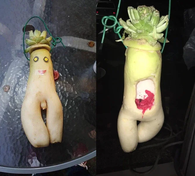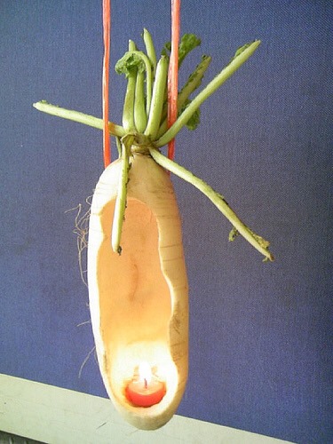 另外除了奶粉罐,不少人還會用食物來DIY燈籠,最常見的就是白蘿蔔和西瓜,尤其是要找長相怪異的蘿蔔,然後在後面挖洞插上蠟燭,這樣一來,簡單又便宜的燈籠就完成了,而且邊提還可以邊享受到烤蘿蔔的香味呢!