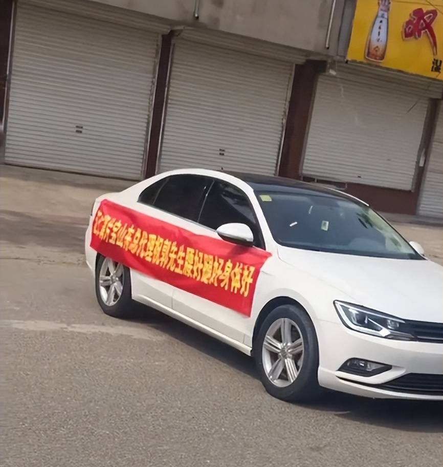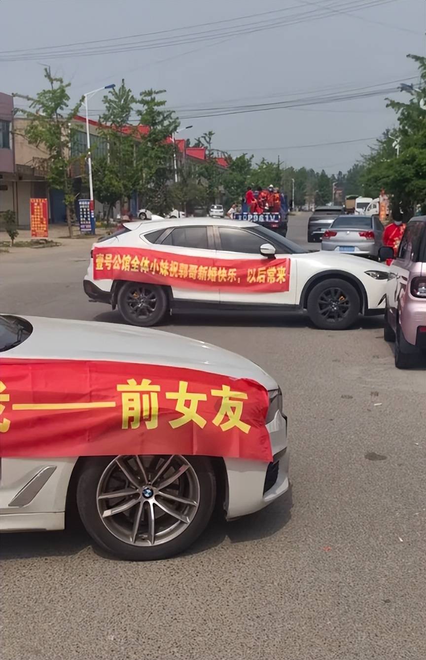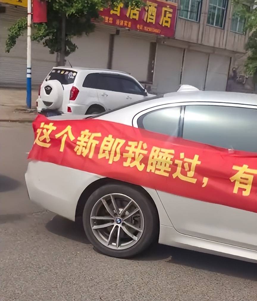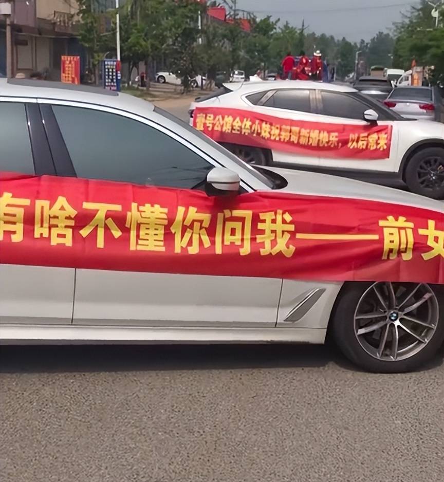 在最前面的兩輛小車側身上,一輛寫著某總代祝新郎腰好腿好身體好,而另外一輛寫的不僅充滿了火藥味,而且還有著十足挑釁意味。