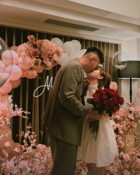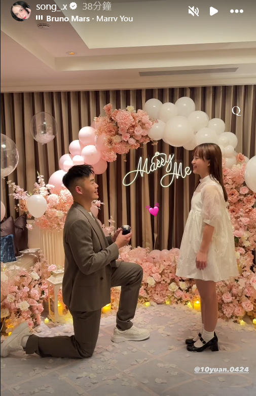 陳詩媛的同屬啦啦隊好友張雅涵也透過IG限動分享求婚的現場畫面,畫面中陳詩媛身穿一件白色的洋裝、王齊麟西裝筆挺跪下掏出鑽戒,求婚成功後,兩人也開心接吻。