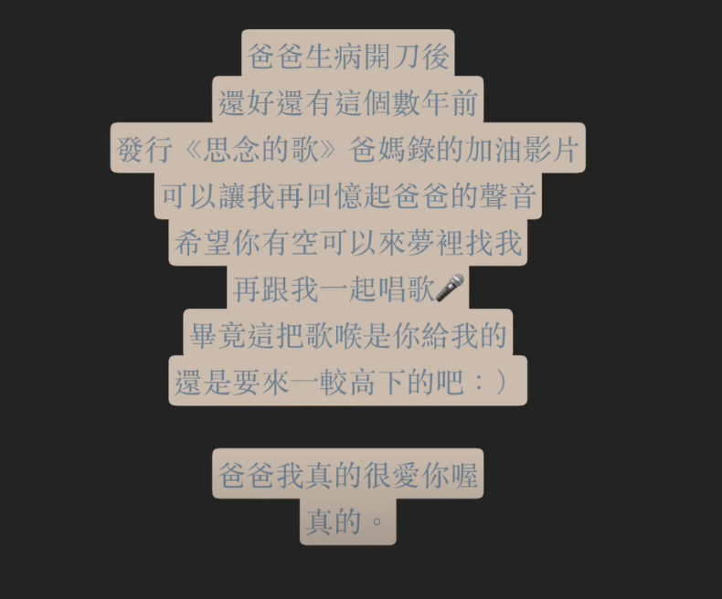快訊/剃平頭陪父抗癌!38歲歌后「驚傳爸爸離世」享壽68歲 趕見最後一面「半夜心碎求1事」