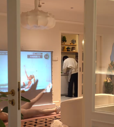 護膚完女子也沒閑著,又換了身運動套裝,打開電視機開始跟著做運動了。