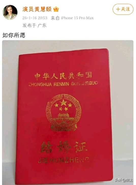 1月16日,黃慧頤更直接曬出結婚證,並配文:如你所願。