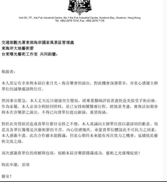 據《自由娛樂》報導,何超儀透過聲明表示,與她結縭21年的老公陳子聰,近期突然身體不適,經醫師評估後,建議需盡快赴美、進行手術。作為摯愛的家人,她必須全程陪同照料,「經慎重考慮,實無法如期參與音樂節之演出,不得以向貴單位提出辭演,萬望海內涵!」