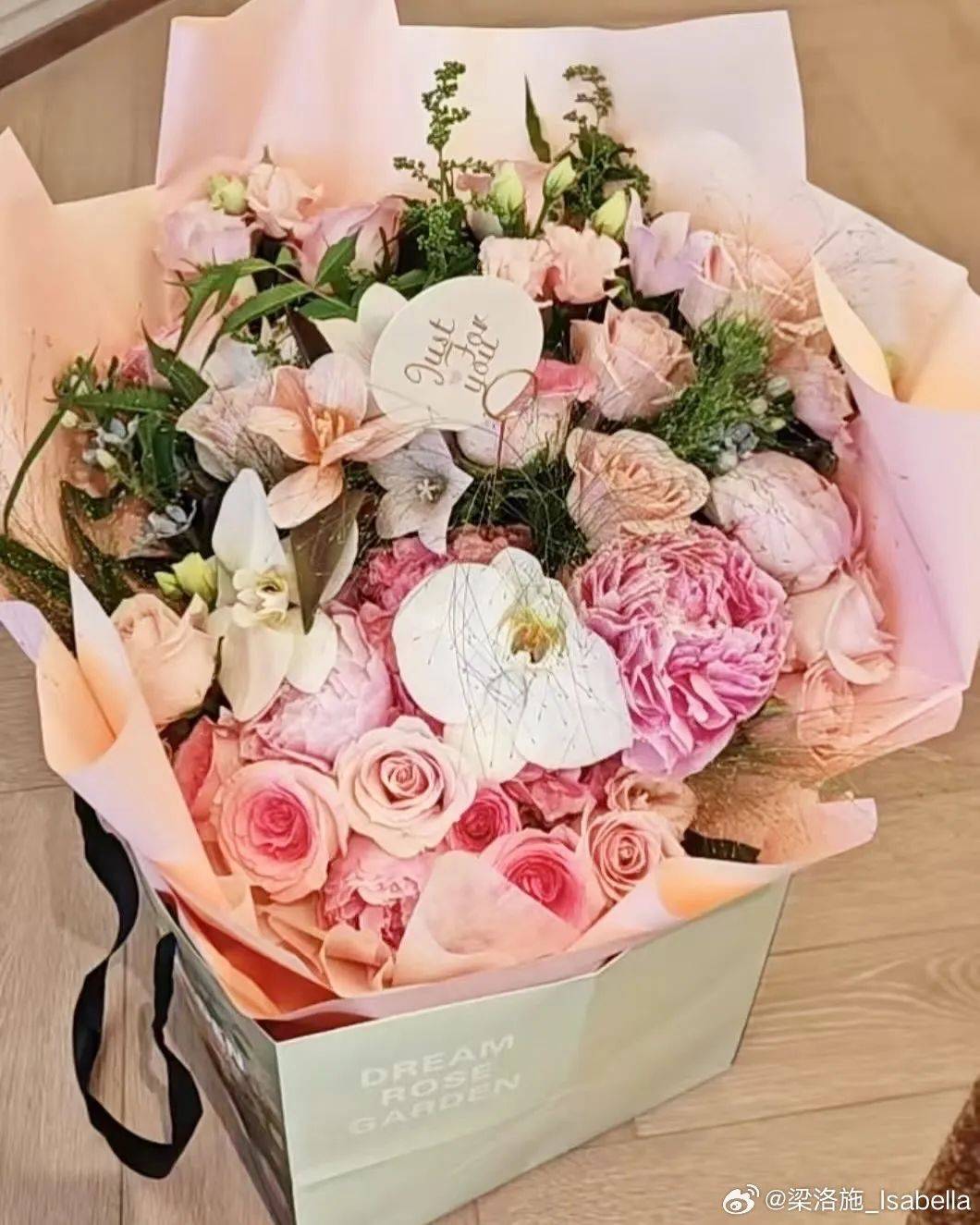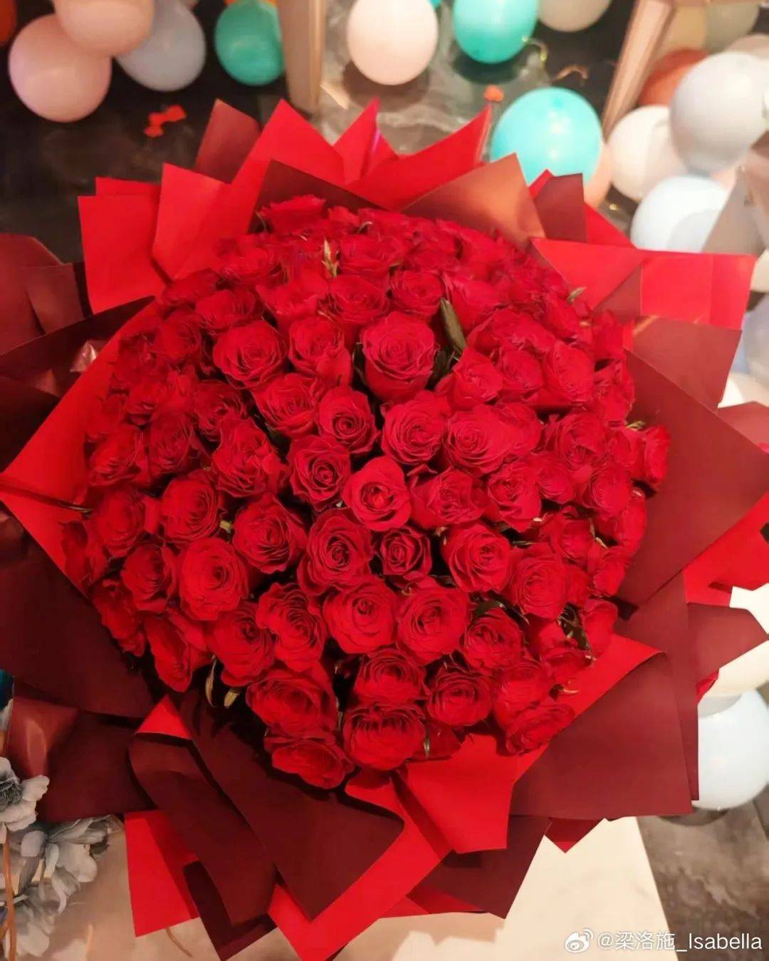 當天她還收穫一波美麗的鮮花。其中一束99朵紅玫瑰配紅色包裝,簡單粗暴的直男畫風,疑似出自新男友之手~
