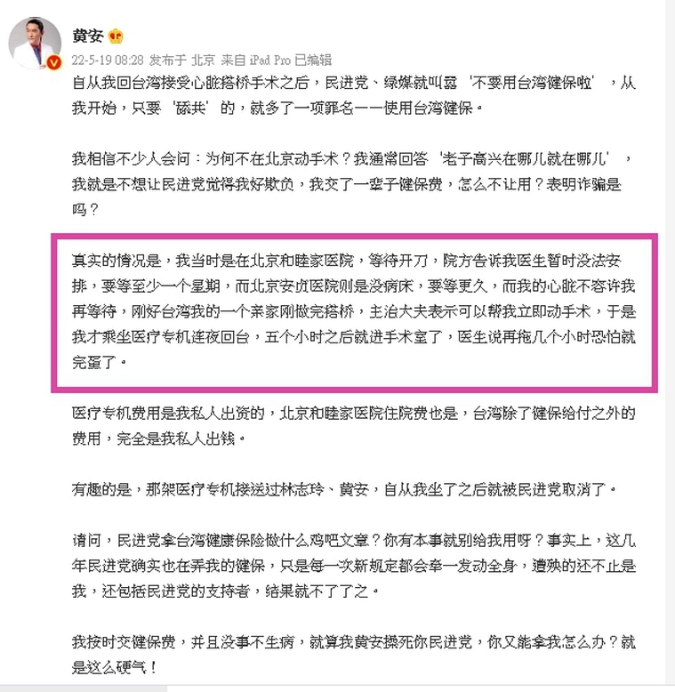 黃安忍7年吐真相!揭內幕當年「不能在中國動手術」回台爽用健保 陸網友驚「你膽子真大」:辱華了