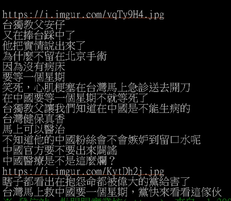 文章曝光後台灣網友則在論壇PTT上嘲諷,「笑死,心肌梗塞在台灣馬上急診送去開刀。在中國要等一個星期不就等死了,台獨教父讓我們知道在中國是不能生病的」、「中國官方要不要出來闢謠?中國醫療是不是這麼爛? 」、「大膽,拐彎說祖國的醫生效率差、病人多」,對於黃安說一套做一套的行為還是相當不滿。