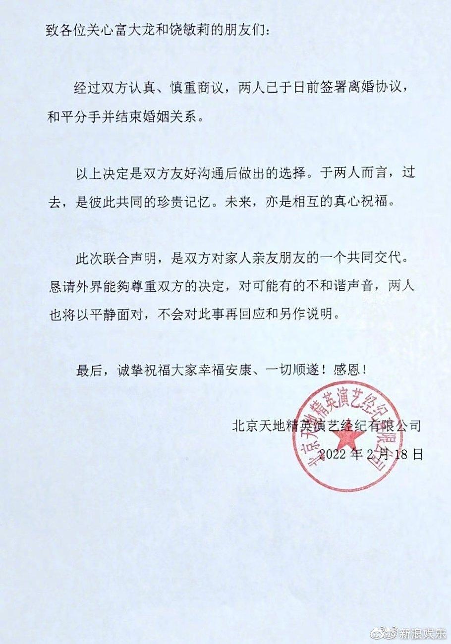 聲明內容簡單,沒有太多撕扯,簡單來說就是兩人和平分手,道一聲珍重,各自友好。