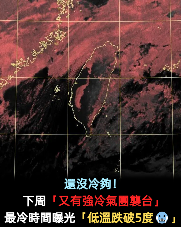 還沒冷夠!下周「又有強冷氣團襲台」 最冷時間曝光「低溫跌破5度」 Elmo 2026-01-06 檢舉 圖片來源:《自由時報》面對這波寒流來襲,網友們紛紛留言提醒:「真的要多穿幾件,別逞強啊!」、「家裡長輩跟小朋友要特別注意保暖」、「早晚溫差大,出門記得帶外套」、「這種天氣最容易感冒,大家小心身體」、「電暖器、暖暖包趕快準備起來!」 Advertisements 圖片來源:《TVBS》影片來源:東森新聞 CH51資料來源:《TVBS》 Advertisements 回首頁 2/2 Advertisements 猜你會喜歡 睡覺也冷到發抖!寒流來襲「日本三明治蓋被法」再翻紅 網友實測狂讚「再加一神物」暖到流汗 低溫探5度冷爆!氣象局曝「回暖時間點」冷到這天:上升10度 元旦越晚越冷!氣象專家警告「第一波寒流」要來了 急凍4天「創入冬最低溫」時間點曝光 編輯精選推薦 More + 快訊/38年台灣老牌旅行社「驚傳停業」! 腹痛緊急送醫!25歲女子開刀「取出1公斤黑球」 醫曝「真實病因」傻眼了:整個胃都堵住... 功德圓滿了!台語歌后「悲曝他離世」享壽95歲 淚喊:去當快樂的神仙吧... 以為只是小感冒!本土女星悲痛證實「他併發肺炎過世」 一度淚灑現場「後悔同意插管」 曾比江蕙紅!台語歌后「爆未婚生子」遭指指點點 「2次手術害癱瘓」72歲近況曝 空窗多年!68歲陳美鳳突羞認「身邊有個他」 40年前就認識「遭男方母親拆散」 無預警宣布喜訊!台語歌王「首曝光帥兒」有顏又有才 「考一次就上」網讚:虎父無犬子 台灣大咖病逝「享壽83歲」!周遊告別式痛哭「認婚內出軌」:兒子很恨我... 年底歷經喪母之痛!75歲郭台銘「消失1個月罕現身」 驚見他「一頭白髮入鏡」衰老原因曝光 相差18歲!58歲康康自爆「與老婆分房12年」驚呆眾人 提到沈玉琳「坦言罹同1病」:必須警惕... 85歲失智父身亡!林葉亭突宣布「皈依佛門」 遇大師「開示一番話」忍不住淚崩 婚變尪落跑!單親媽「獨扛千萬債養孩」到處躲黑道 「一開口驚艷眾人」熬成台灣歌后 24歲兒失明!于美人爆「他在飯店掃廁所」維生 不盼紅包只求「別再花我的錢」 出國注意!知名航空公司「全面停飛台灣」 4000旅客受衝擊「錢恐討不回」 快訊/失聯14小時!花蓮飛官「最後求救訊息曝光」母悲痛拄拐杖現身 離婚11年!洪榮宏愛女結婚「終破冰前妻」 「2爸爸牽她進場」催淚畫面曝 趕在40歲前閃婚!八點檔女星「宣布嫁給他」 尪驚人身分曝「媒人是柯叔元」 本土劇女星生了!7年前凍卵「終於來到我身邊」 歌手尪嗨喊:生個足球隊 弟成植物人、姊猝逝!玉女歌手「遭前夫設套」騙走娘家房產 「狠斬16年婚姻」近況曝 22歲愛女病逝!資深男星「走不出喪女痛」留白長髮現身 掛骨灰項鍊「代女做1事」惹淚 台語歌后慟別摯愛!告別式上認「早隱瞞病情」 道歉哭喊:原諒我簽放棄急救 65歲男星獨居暴斃!大咖女星放下恩怨「送前夫最後一程」 昔遭動手6年嘆「死者為大」 最新/賈靜雯深夜慟曝「她已離世」 淚PO合照喊:真的好愛你... 15歲兒「睡夢中離世」!本土女星「送愛子火化」求做1事 「PO照圓滿了」:媽媽和你永不分開 低溫探5度冷爆!氣象局曝「回暖時間點」冷到這天:上升10度
