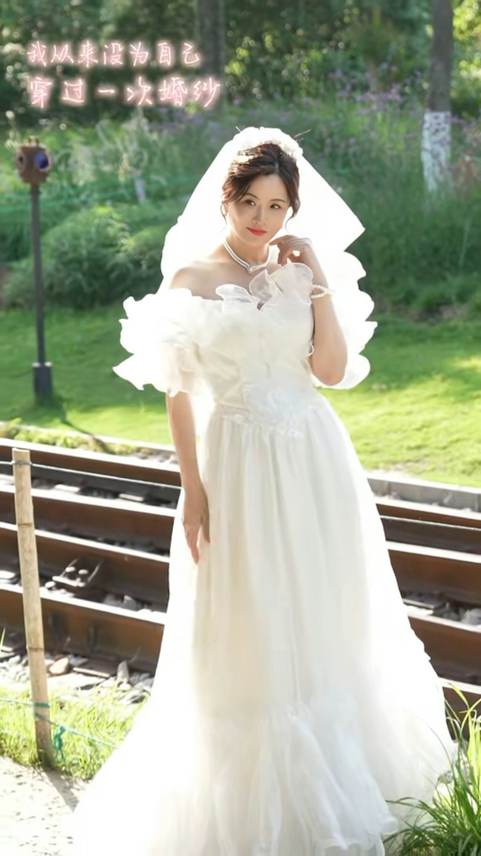 身穿露膊婚紗、戴上頭紗同珍珠頸鏈的她,一身造型充滿年代感,很像是我們時常在90年代港劇中看到的新娘造型。