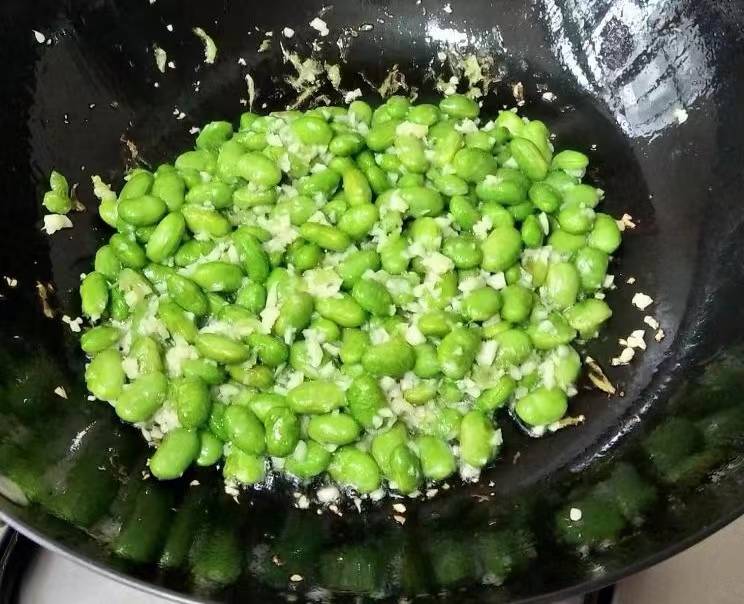 2、在鍋中淋入食用油,這個時候就把蒜蓉倒進去,逐漸加熱的過程中,蒜香味被激發出來,順勢將毛豆倒進去,快速炒勻。