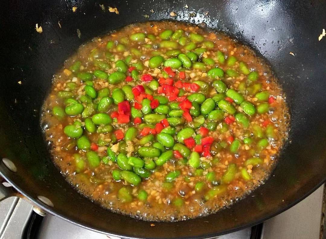 3、接著調入生抽,蚝油,鹽,再來一些熱水,調好味道後燜五六分鐘,使其徹底熟透,最後放點辣椒炒勻即可。