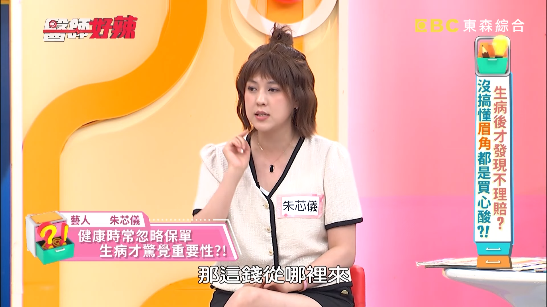朱芯儀表示,因為家族之中鮮少有人罹癌,因此在當初投保的時候,沒有買很多癌症險,直到得了癌症去申請保險,才發現自己所投保的項目根本拿不到多少錢,對於龐大的醫藥費而言可說是杯水車薪,導致她幾乎散盡錢財:「我沒辦法賺那麼多錢啊!」眼看根本沒有可以運用的款項,也讓她深感不安。