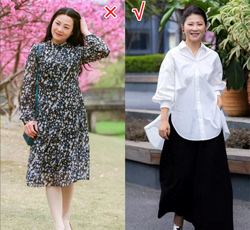 對比看一下,深色碎花裙與簡約黑白的搭配,前者暗沉的顏色加上密集印花,披散著頭髮看上去很沒有精神,而後者上身白色下身黑色,將頭髮紮起來,即使是很簡單的搭配,也更氣質減齡。