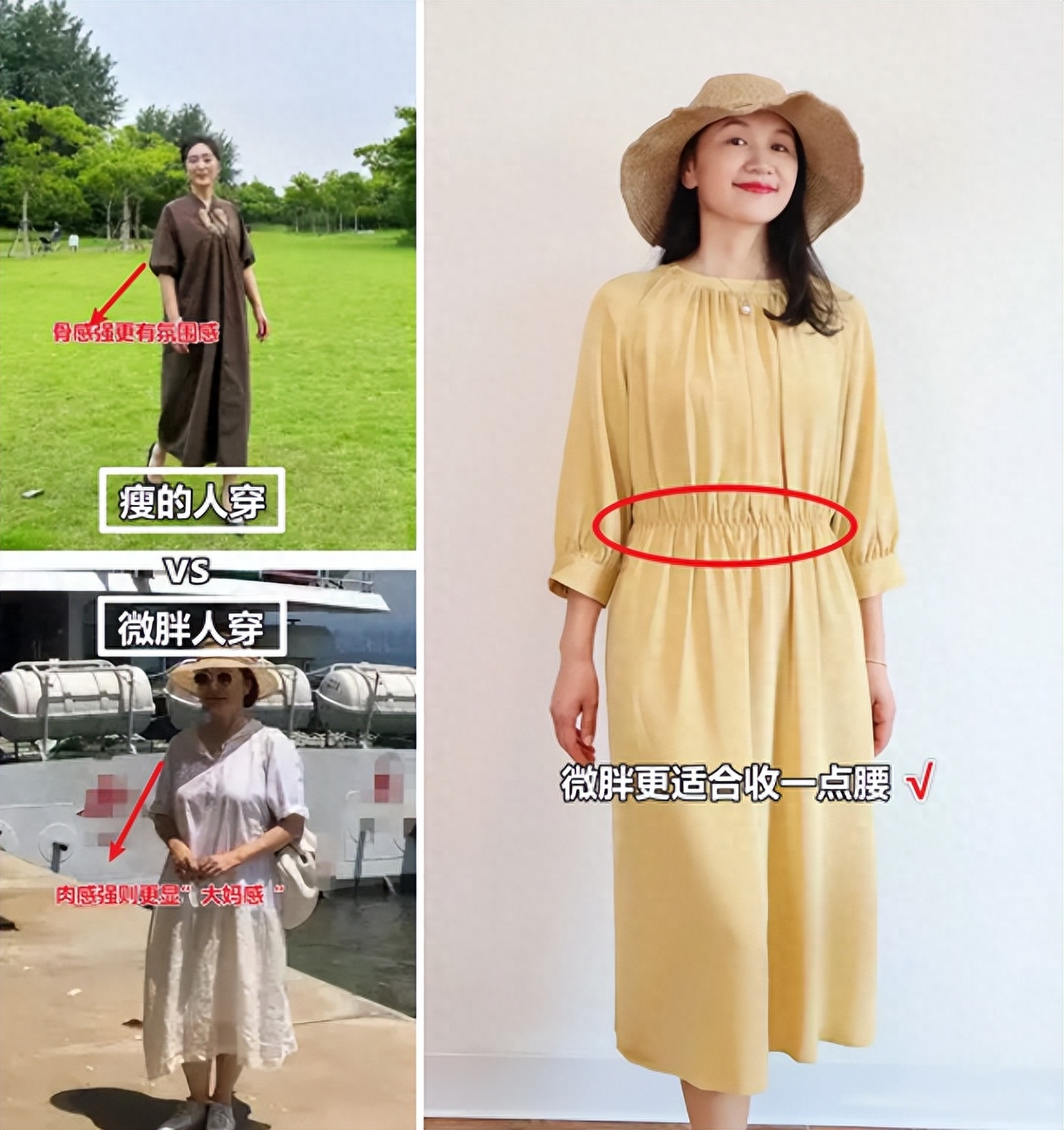 第三點要注意的就是很多人在面對身材發福時都會選擇寬鬆的服裝來遮肉,尤其是裙子,但說實話,對於微胖的女性來說,越寬鬆的服裝越顯臃腫,反而是帶有一點收腰效果的服裝能讓身形看上去更纖細且更有氣質。