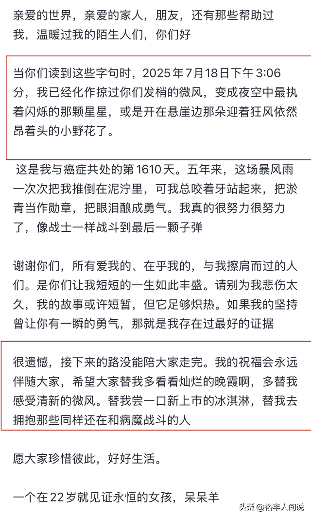 7月18號晚,抗癌網紅圈傳出悲痛消息,那個曾與骨癌鬥爭了差不多5年時間的女孩「呆呆羊」去世了,得年22歲。她用幾百字總結了自己的人生,完成了生命的蛻變,對於粉絲來說,也許很遺憾,但對於她來說,這何嘗不是一種解脫。