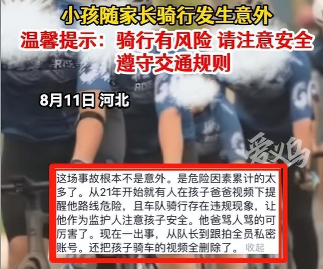 孩子出事後,這位父親以及他的騎行隊伍成員、都將社群帳號設為私密狀態,之前發布的有關騎行的影片、也全部刪除!這種行為似乎在試圖避免更多的責任追究。
