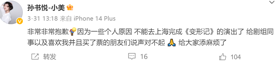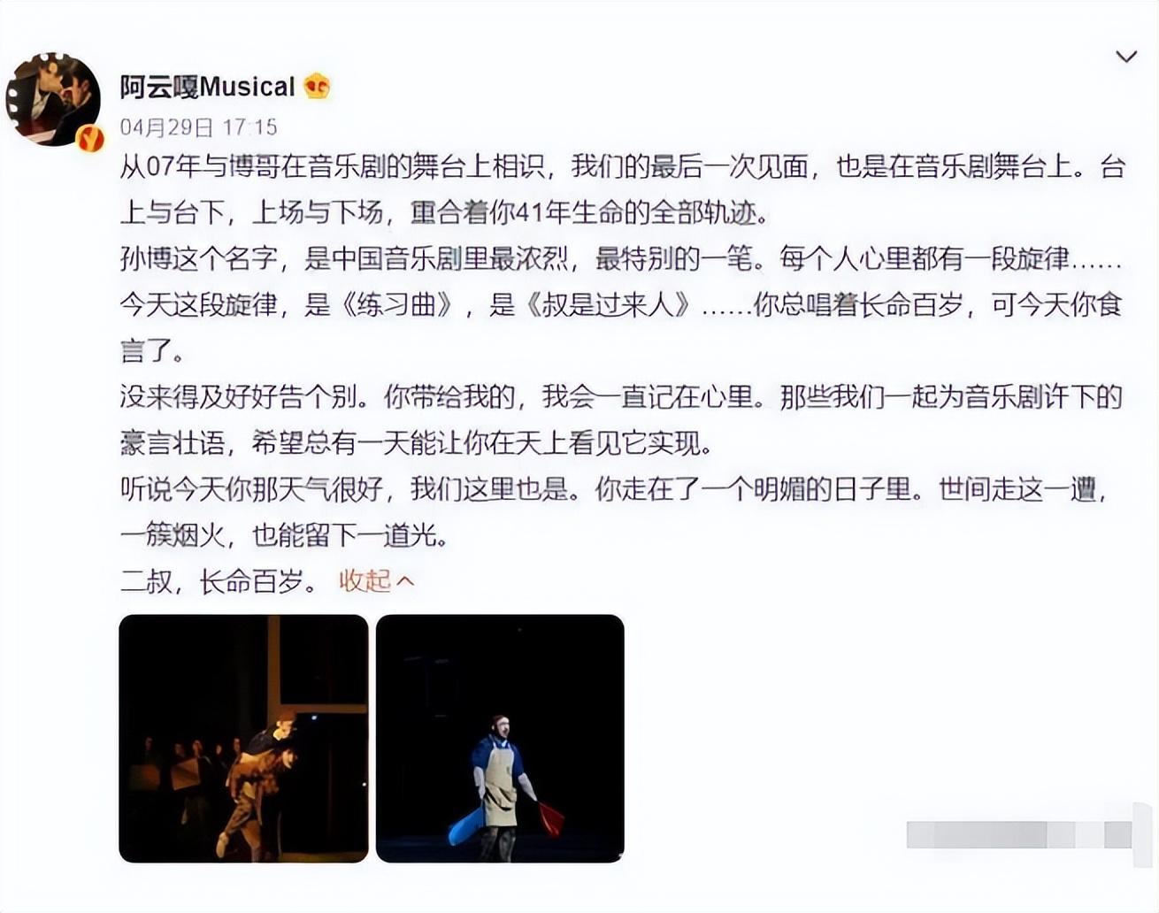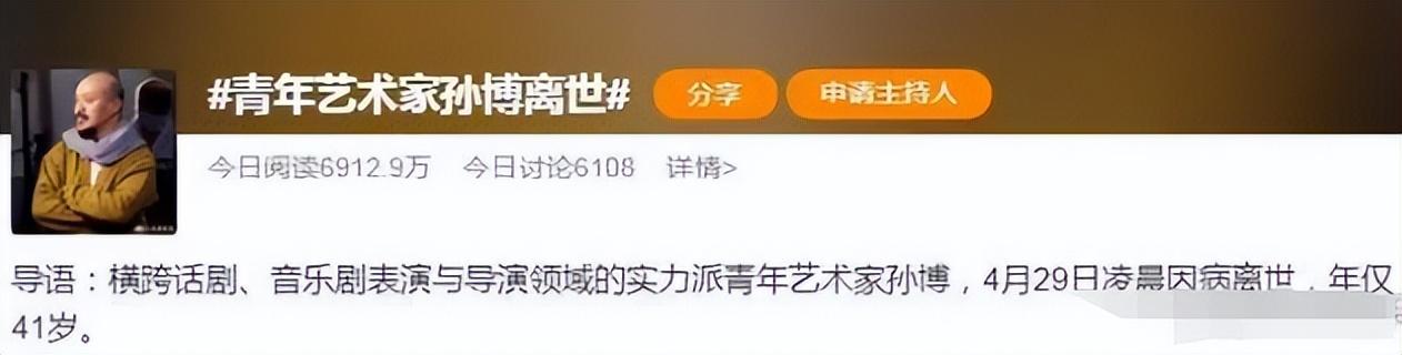 2023年4月29日,著名話劇藝術師、青年演員孫博因肝癌離世,其年齡也僅才41歲。