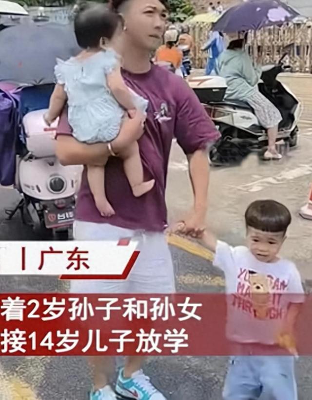 近日,廣東一名男子帶著孫子和孫女去學校接小兒子放學的畫面,衝上了熱搜,男子一手抱著孫女,一手牽著孫子,他的小兒子才14歲,念初中,等兒子從學校出來,看見爸爸這幅情景,父子兩人的表情瞬間亮了。