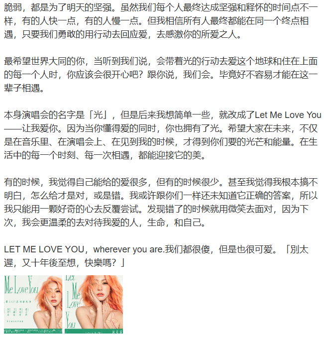 薛凱琪也在文中感性表示,相信有一天會和方大同再重逢:「我相信所有人最終都能在同一個終點相遇,只要我們勇敢的用行動去回應愛,去感激你的所愛之人」她也承諾會繼續以光與愛影響這個世界,延續方大同生前的理念:「下次,我會更溫柔的去對待我愛的人,生命,和自己。」