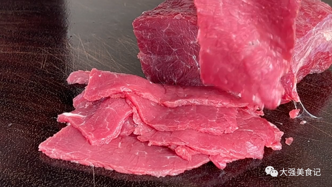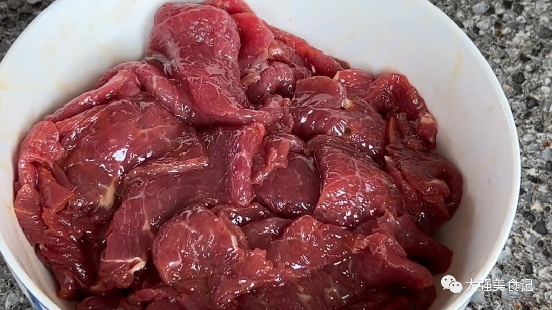 牛肉不僅適合健身人群,也適合中老年人。經常吃可以預防骨質疏鬆。把牛肉切成三毫米左右的肉片,牛肉大片一點,吃起來更加過癮。切好的牛肉裝到碗中,