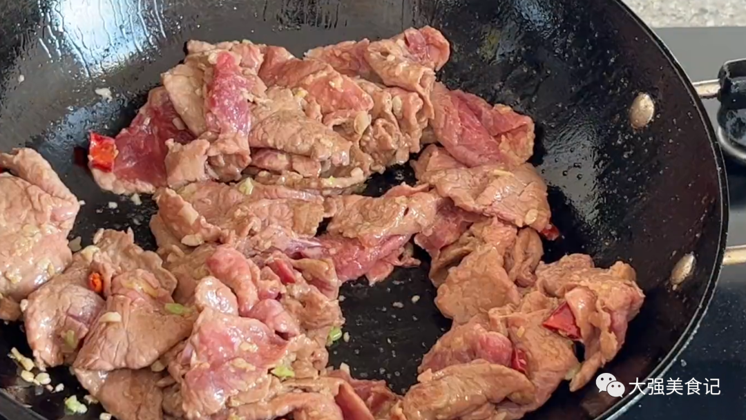 起鍋加點油,先下點蔥蒜末爆香,再加點干辣椒進來一起爆香。炒香以後再加入牛肉,將牛肉大火炒香。多加點油進來,避免牛肉粘鍋,把牛肉炒到變色。
