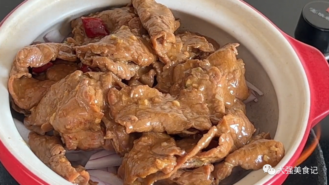 牛肉炒到全部變白後,再肉調好的芡汁,這裡肉快速的翻炒均勻,炒到八成熟就可以了。提前把砂鍋加熱好,加點洋蔥絲進來,再加點油把炒好的牛肉打進來。