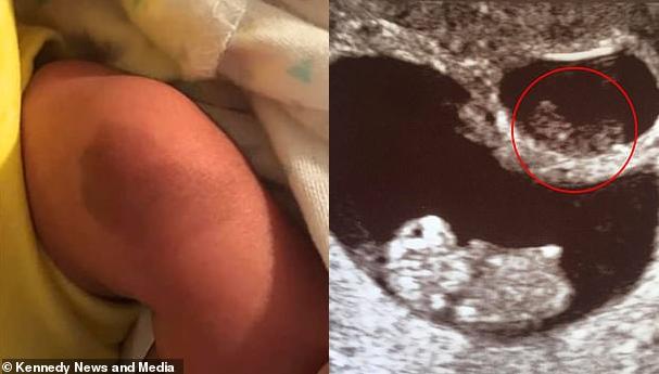 不過慶幸的是,腹中剩下的那個男寶寶發育得很好,並在幾個月後健康落生了。更令人驚訝的是,男寶寶出生時腿上就帶有一個深色的胎記。