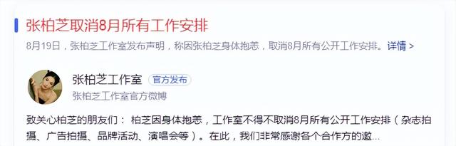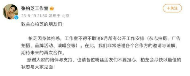張柏芝近兩年和珠寶奢牌的合作,讓眾人大飽眼福,然而就在8月19日深夜近10點,張柏芝工作室在毫無預警的情況下,稱張柏芝身體抱恙,8月份所有公開的工作安排,包括雜誌拍攝、廣告拍攝、品牌活動、演唱會等全部取消,並且感謝各個合作方的邀請與諒解,期待未來再次合作。