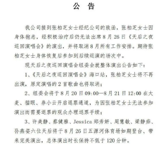 原定於8月26日舉辦的「天后之夜巡迴演唱會」,官方帳號也緊隨其後宣布張柏芝缺席的消息。這份公告中,有關主辦單位表示在演唱會前夕收到了張柏芝身體抱恙,積極治療後仍無法出席的通知,很遺憾與張柏芝不能順利合作。