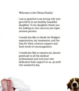 大谷翔平在社群平台上發布了一張寶寶的可愛腳丫照片,同時附上一段情深意切的文字:「歡迎來到大谷家族,衷心感謝我親愛的妻子,為我們帶來了健康美麗的女兒。」他更坦承初為人父的忐忑心情,表示女兒的到來讓他成為一位既緊張又焦慮的新手爸爸。這位棒球巨星不忘感謝道奇球團、隊友們的暖心支持,以及醫護人員的專業照顧。