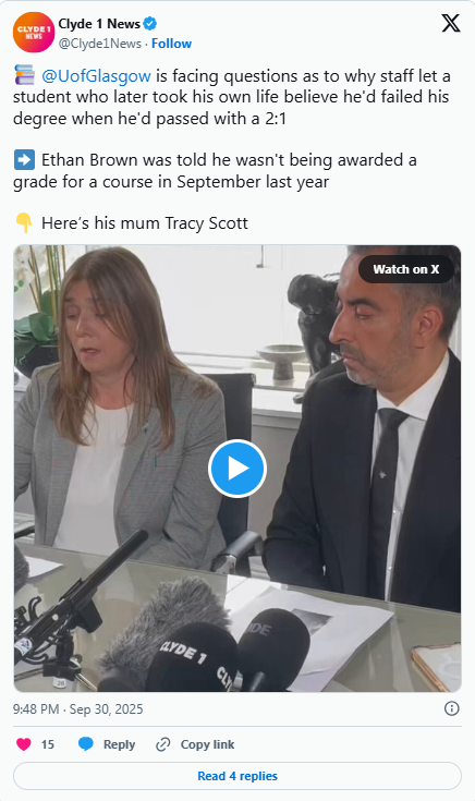 這名就讀格拉斯哥大學地理學系的23歲學生伊森,在2024年9月收到學校通知,表示因一門課程學分不足而無法順利畢業。他當場崩潰無接受,最後於同年12月13日畢業典禮當天選擇輕生。