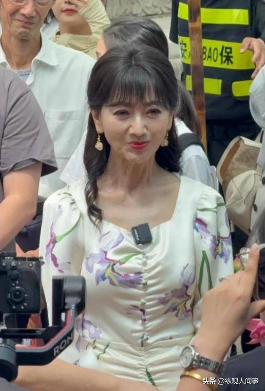 照片中,趙雅芝還是留著齊劉海、燙著捲髮,穿著一身素色的連衣裙,打扮的十分優雅。