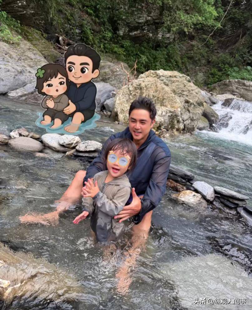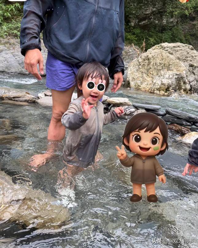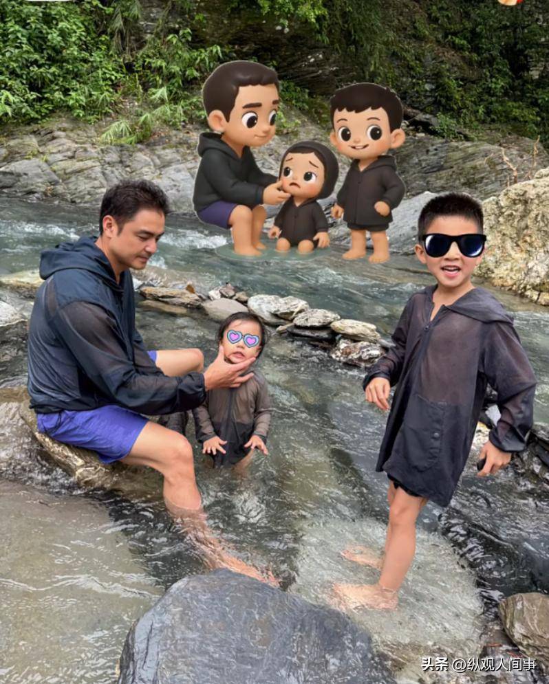 在影片中,明道的兒子也露面了,只見三人穿著防曬衣,在山間的小河裡玩耍,他老婆雖然沒露面,但肯定是一家四口來的,看起來非常幸福。