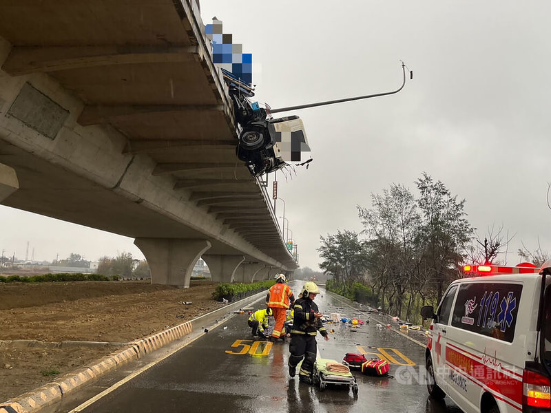 由於聯結車衝出橋墩,車體碎片及護欄的水泥石塊掉落下方平面道路,當時天色昏暗,也造成兩名騎士經過時摔倒,兩人意識清楚,一人肢體多處擦傷、一人雙膝撕裂傷,均被送往醫院救治,針對這起事件,警方調查4名駕駛皆為酒駕,也到橋下蒐證,詳細事發原因及肇責,仍待進一步釐清。