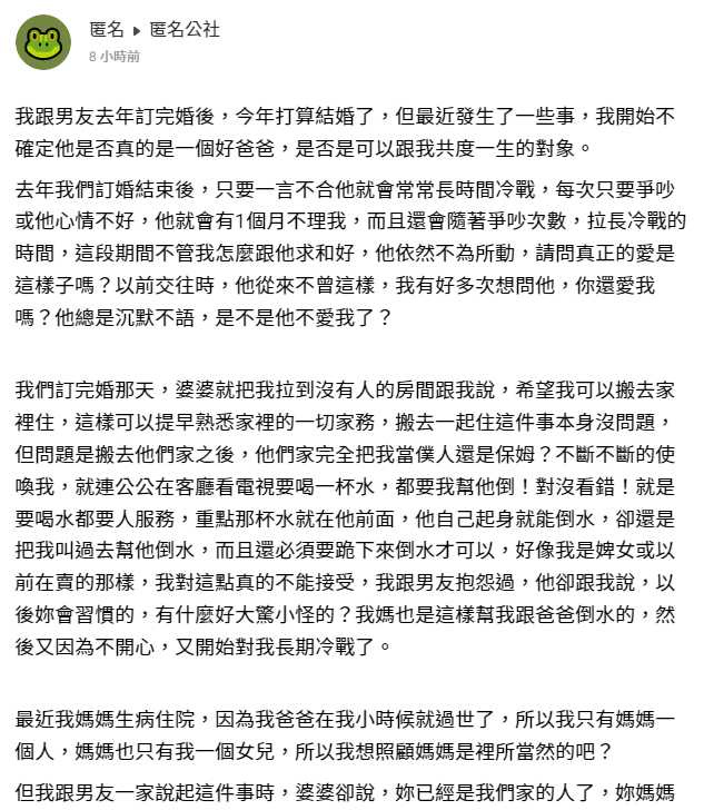 這時,未婚夫也附和她媽:「別想叫我出錢幫妳請看護,妳嫁來我們家,跟妳媽就是陌生人了,誰會幫陌生人請看護?」指責她別跟準婆婆頂嘴,必須下跪道歉,原PO忍無可忍,終於從未婚夫的糖衣砲彈中醒來,原來,過去對方買禮物和水果送她母親、說會把她當親生媽媽孝順,一切都是假的。