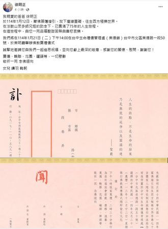 台灣知名主持人「突傳過世」!兒悲痛證實:「跟佛祖好好地走」 Cara 2025-01-15 檢舉 圖片來源:ETtoday值得一提的是,徐明正生前始終堅持理念,他曾在社群平台表明立場:「50年的民主鬥士不是為任何黨派,而是為了台灣的民主,讓主權真正歸屬人民。」、「台灣人民拒絕打打鬧鬧的民主」、「民主就是選擧輸得起,輸不起,那就無法東山再起」,顯示即使在生命最後階段,仍心繫台灣民主發展。資料來源ETtoday Advertisements 回首頁 2/2 Advertisements 猜你會喜歡 快訊/知名主持人「驚傳陳屍家中」死因曝光 前一晚才正常主持 編輯精選推薦 More + 離婚11年!洪榮宏愛女結婚「終破冰前妻」 「2爸爸牽她進場」催淚畫面曝 空窗多年!68歲陳美鳳突羞認「身邊有個他」 40年前就認識「遭男方母親拆散」 以為只是小感冒!本土女星悲痛證實「他併發肺炎過世」 一度淚灑現場「後悔同意插管」 曾比江蕙紅!台語歌后「爆未婚生子」遭指指點點 「2次手術害癱瘓」72歲近況曝 快訊/才過1年!賴佩霞驚傳「他不幸身亡」急飛美國奔喪 臨終前「女兒陪在身旁」 晚年兒孫滿堂!73歲影壇大哥「拄拐杖現身」腳步蹣跚 兒子「全程攙扶不喊累」網羨:又帥又孝順 全遣送中國!台灣873名詐騙犯慘了「外交部出面回應」 快養不起小孩!本土男星「開計程車、斜槓房仲」 突宣布「離開台灣」:演藝圈沒工作 婚變尪落跑!單親媽「獨扛千萬債養孩」到處躲黑道 「一開口驚艷眾人」熬成台灣歌后 台海若開戰「哪縣市最安全?」 網狂推2地:「打都不會打」 快訊/曾叱吒政壇!蔡英文「最信任的她過世」 死訊被證實「已舉辦告別式」 85歲失智父身亡!林葉亭突宣布「皈依佛門」 遇大師「開示一番話」忍不住淚崩 慘遭飛車拖行!八點檔男星「臉全磨爛」驚悚畫面曝 目睹女星「崩潰嚇哭」頻發抖 相差18歲!58歲康康自爆「與老婆分房12年」驚呆眾人 提到沈玉琳「坦言罹同1病」:必須警惕... 功德圓滿了!台語歌后「悲曝他離世」享壽95歲 淚喊:去當快樂的神仙吧... 好像在拍雜誌!網路爆紅「雪地金髮小鮮肉」氛圍感滿滿 又奶又帥「穿西裝秒變時尚模特」反差太迷人 65歲男星獨居暴斃!大咖女星放下恩怨「送前夫最後一程」 昔遭動手6年嘆「死者為大」 24歲兒失明!于美人爆「他在飯店掃廁所」維生 不盼紅包只求「別再花我的錢」 本土劇女星生了!7年前凍卵「終於來到我身邊」 歌手尪嗨喊:生個足球隊 15歲兒「睡夢中離世」!本土女星「送愛子火化」求做1事 「PO照圓滿了」:媽媽和你永不分開 趕在40歲前閃婚!八點檔女星「宣布嫁給他」 尪驚人身分曝「媒人是柯叔元」 台灣大咖病逝「享壽83歲」!周遊告別式痛哭「認婚內出軌」:兒子很恨我... 22歲愛女病逝!資深男星「走不出喪女痛」留白長髮現身 掛骨灰項鍊「代女做1事」惹淚 台語歌后慟別摯愛!告別式上認「早隱瞞病情」 道歉哭喊:原諒我簽放棄急救 最新/賈靜雯深夜慟曝「她已離世」 淚PO合照喊:真的好愛你...