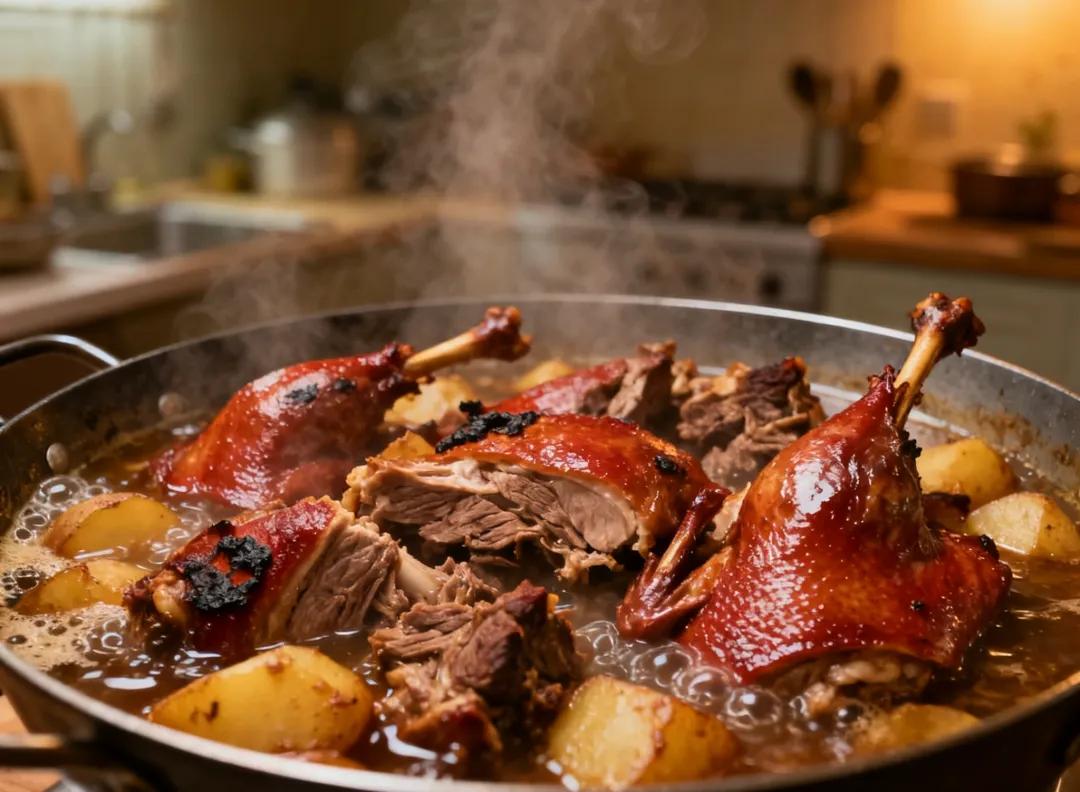 加適量鹽和冰糖,再燉20分鐘,直到湯汁濃稠、鵝肉軟爛入味,就能出鍋。