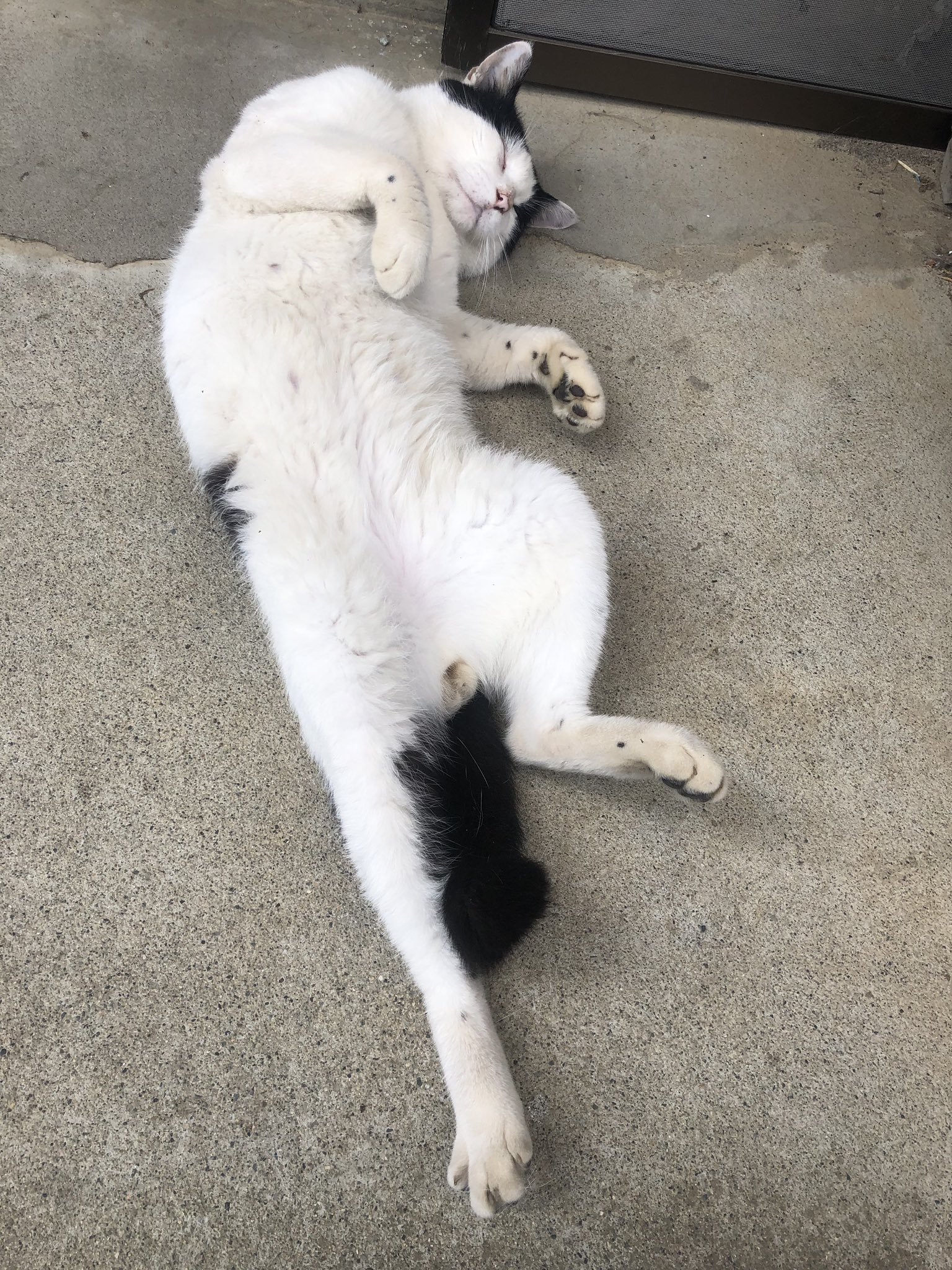 原來這隻黑白貓幾個月前就開始出現在夜壹家的院子裡,不知道從哪來的貓貓挺親人的,家人們順勢照顧起牠來,貓咪也就這麼留下來了,經常會在他們家門口睡覺,相當自在愜意~