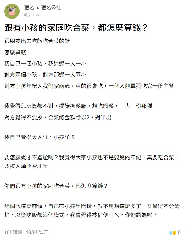 「小孩也不是嬰兒的年紀,真要吃合菜,按人頭收費才是」,他認為,應該「大人X1,小孩X0.5」比較合理,卻不敢明說,又怕以後再約都會被占便宜,只好苦惱詢問大家:「怎麼說才不尷尬啊?你們跟有小孩的家庭吃合菜,都怎麼算錢?」