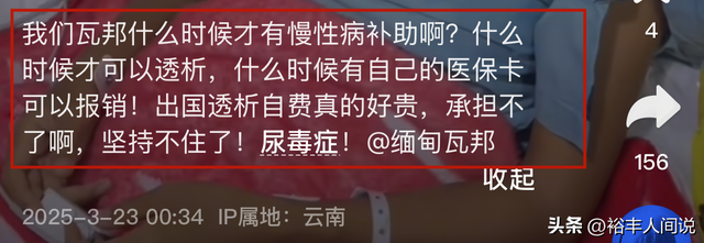 大約兩年前,琳琳不幸確診尿毒症,由於當地的醫療水平有限,她不得不跨國來到中國做透析,即便是費用高昂,為了活命,她也要這樣做。為此,她還曾詢問佤邦政府,到底什麼時候才能有慢性病補助啊,什麼時候有自己的醫保卡可以報銷啊,出國透析自費真的好貴。