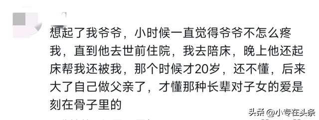 網友想起了自己的爺爺,小時候感覺他並不疼自己,在他去世前住院時,網友去陪床爺爺,雖然爺爺身體不適晚上仍起床幫他蓋被子,20歲的他那時還不懂這種愛,自己當了父親終於知道愛是刻在骨子裡的。