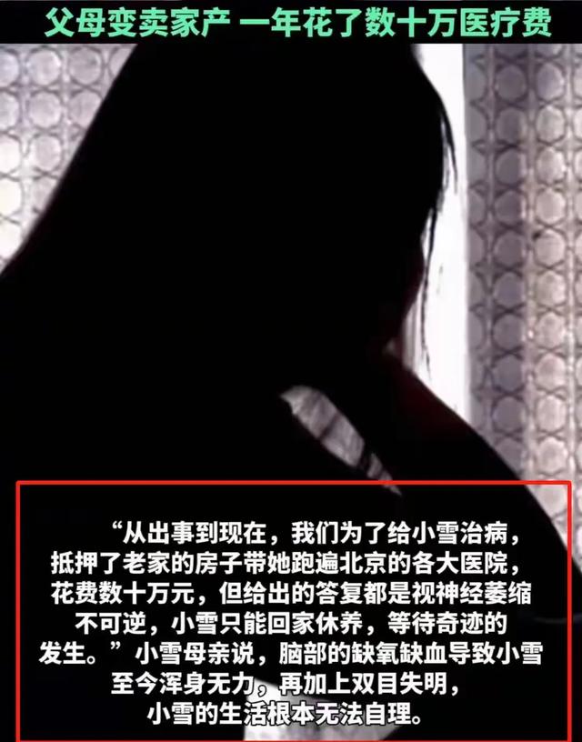 勞雲雪的診斷書長達3頁:視神經萎縮、缺氧性腦病、腸梗阻...29歲的她每天需服用7種藥物,右耳永遠聽著刺耳鳴叫。母親李女士紅著眼眶說:「她總摸著婚紗照問媽媽,我漂亮嗎?,可那雙眼睛再也映不出星光了。」