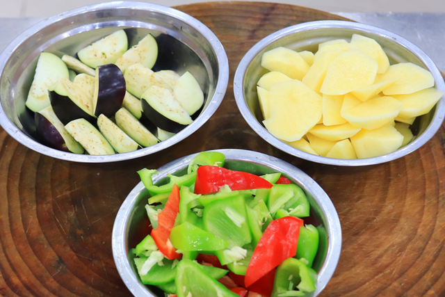 1.紫茄子清洗乾淨,不削皮切成滾刀塊放入盆中,加入一勺白醋、放入一小把澱粉抓勻,讓澱粉均勻裹在茄子表面,防止茄子吸油;青椒、紅椒各一個切成滾刀塊;馬鈴薯去皮,也切成滾刀塊;再切點蔥花、蒜末備用。