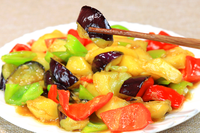 2.鍋內燒水,放入馬鈴薯煮2分鐘左右,煮斷生以後撈出控干水分,撒上澱粉準備炸製。鍋內燒油,油溫五成熱時把馬鈴薯放入鍋中炸20秒鐘,再放入茄子一起炸,炸至馬鈴薯和茄子表面微黃色時放入青、紅椒稍微滑一下油,倒出來備用。