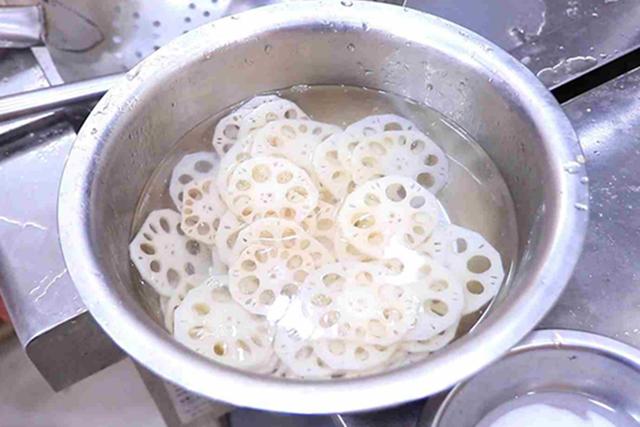 2.鍋內燒水,加入少許食鹽和白醋,水燒開以後放入藕片,焯水30秒鐘倒出來,放入涼開水中過涼,這樣藕片吃起來更加清脆。