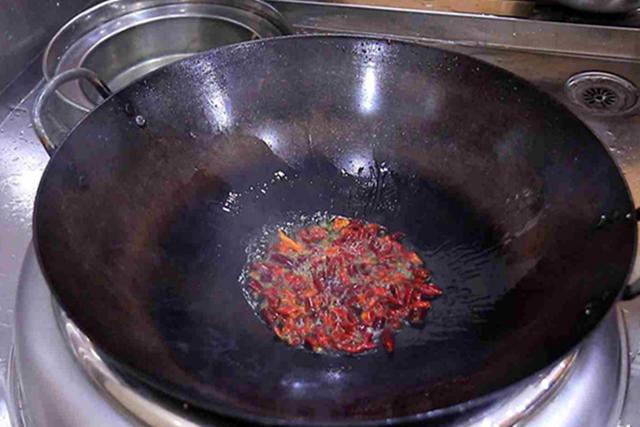 3.把鍋燒熱,加入一勺植物油,油溫五成熱時,放入一把干辣椒,一小撮花椒,開小火一起翻炒,辣椒和花椒炒香以後,倒入小碗中稍微晾涼一些,加入生抽10克、食鹽2克、雞精1克、白糖4克中和辣味,香醋10克,再撒入一些白芝麻攪拌均勻備用。