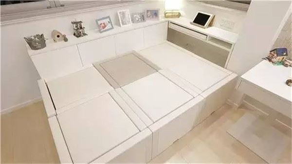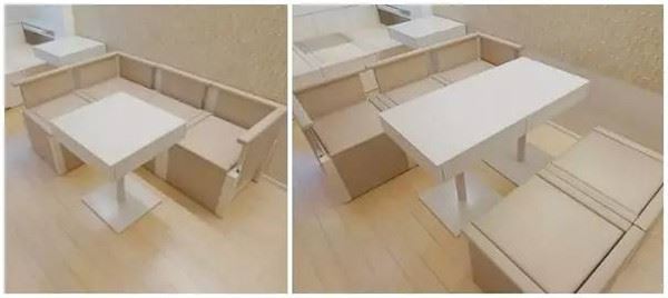 3個孩子需要分開睡的問題也解決了,接下來就是爸爸媽媽的問題了。本間貴史用自己設計出「三段椅」神奇地將客廳和臥室合二為一。