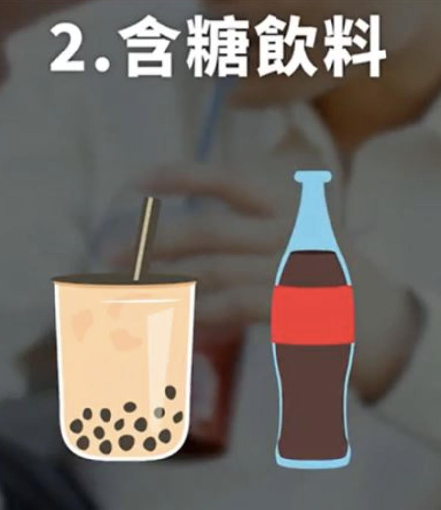 第二類是含糖飲品,涵蓋手搖飲跟汽水。陳醫師指出,不少含糖飲料光是一杯的糖分含量,就已經突破每日建議攝取的上限值,而含糖飲料跟體重上升之間存在明確關聯性。