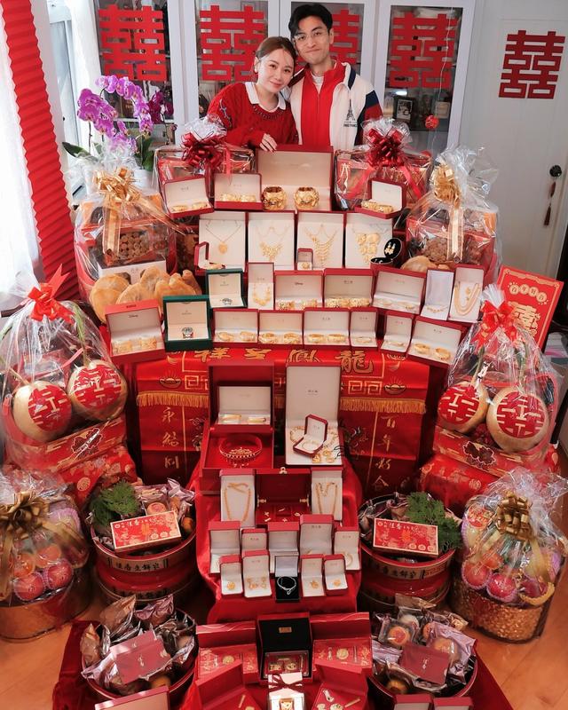 譚杏藍去年8月接受交往約一年的圈外男友Ronald於日本浪漫求婚,今年3月將會榮升人妻,近日與未婚夫先後上載多套訂婚照。只見她過大禮非常大陣仗,單單龍鳳手鐲都有十幾對,金器鋪滿桌非常誇張!